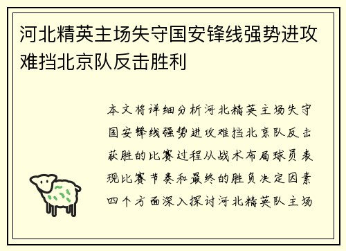 本文将详细分析河北精英主场失守、国安锋线强势进攻难挡北京队反击获胜的比赛过程。从战术布局、球员表现、比赛节奏和最终的胜负决定因素四个方面深入探讨。河北精英队主场面对北京国安时的失利,显现出了球队在防守与进攻之间的不平衡。而北京国安则通过锋线...